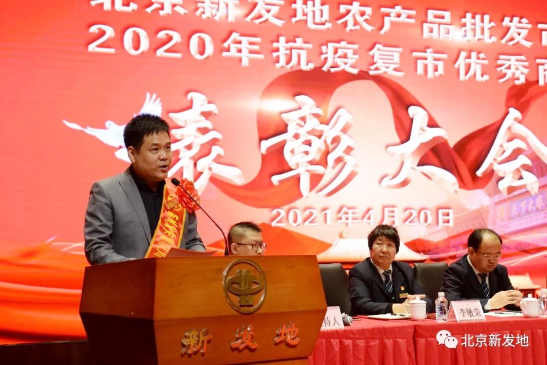 4月20日,北京新发地市场2020年抗疫复市优秀商户表彰大会在全国农产品展销中心三楼隆重举行,我市场总经理郑得厚荣获“抗疫优秀商户”荣誉称号。