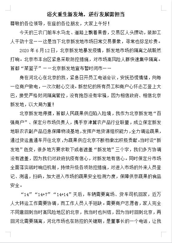作为新发地市场的优秀商户,自疫情发生以来,郑得厚总经理主动参与抗疫工作,冲锋在前,与北京新发地市场团结协作,为保障市场安全贡献了重要力量。大会上,郑得厚总经理作为商户代表向大家分享了勇于担当,积极参与疫情防控、复商复市的具体情况和心路历程。